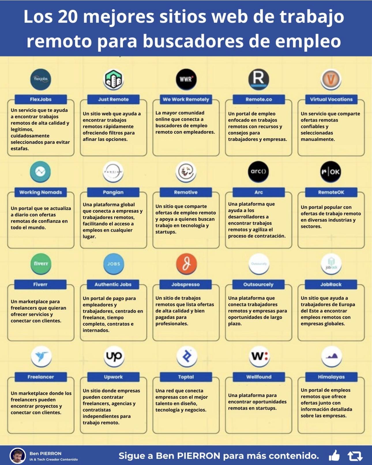 ↳ Un portal de empleos remotos que ofrece ofertas junto con información detallada sobre las empresas.¡Hay millones de trabajos remotos disponibles! Puedes encontrarlos fácilmente si sabes dónde buscar. Aquí tienes 20 sitios web de trabajos remotos para encontrar tu próximo puesto: [🔖 guarda este post para encontrar tu próximo trabajo remoto] 1. FlexJobs ↳ Un servicio que te ayuda a encontrar trabajos remotos de alta calidad y legítimos, cuidadosamente seleccionados para evitar estafas. 2. Just Remote ↳ Un sitio web que ayuda a encontrar trabajos remotos rápidamente ofreciendo filtros para afinar las opciones. 3. We Work Remotely ↳ La mayor comunidad online que conecta a buscadores de empleo remoto con empleadores. 4. Remote.co ↳ Un portal de empleo enfocado en trabajos remotos con recursos y consejos para trabajadores y empresas. 5. Virtual Vocations ↳ Un servicio que comparte ofertas remotas confiables y seleccionadas manualmente. 6. Working Nomads ↳ Un portal que se actualiza a diario con ofertas remotas de confianza en todo el mundo. 7. Pangian ↳ Una plataforma global que conecta a empresas y trabajadores remotos, facilitando el acceso a empleos en cualquier lugar. 8. Remotive ↳ Un sitio que comparte ofertas de empleo remoto y apoya a quienes buscan trabajo en tecnología y startups. 9. Arc ↳ Una plataforma que ayuda a los desarrolladores a encontrar trabajos remotos y agiliza el proceso de contratación. 10. RemoteOK ↳ Un portal popular con ofertas de trabajo remoto en diversas industrias y sectores. 11. Fiverr ↳ Un marketplace para freelancers que quieran ofrecer servicios y conectar con clientes. 12. Authentic Jobs ↳ Un portal de pago para empleadores y trabajadores, centrado en freelance, tiempo completo, contratos e internados. 13. Jobspresso ↳ Un sitio de trabajos remotos que lista ofertas de alta calidad y bien pagadas para profesionales. 14. Outsourcely ↳ Una plataforma que conecta trabajadores remotos y empresas para oportunidades de largo plazo. 15. JobRack ↳ Un sitio que ayuda a trabajadores de Europa del Este a encontrar empleos remotos con empresas globales. 16. Freelancer ↳ Un marketplace donde los freelancers pueden encontrar proyectos y conectar con clientes. 17. Upwork ↳ Un sitio donde empresas pueden contratar freelancers, agencias y contratistas independientes para trabajo remoto. 18. Toptal ↳ Una red que conecta empresas con el mejor talento en diseño, tecnología y negocios. 19. Wellfound ↳ Una plataforma para encontrar oportunidades remotas en startups. 20. Himalayas ↳ Un portal de empleos remotos que ofrece ofertas junto con información detallada sobre las empresas.0 Comments 0 Shares 2 Views 0 Reviews1